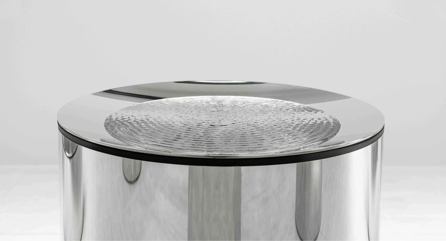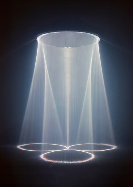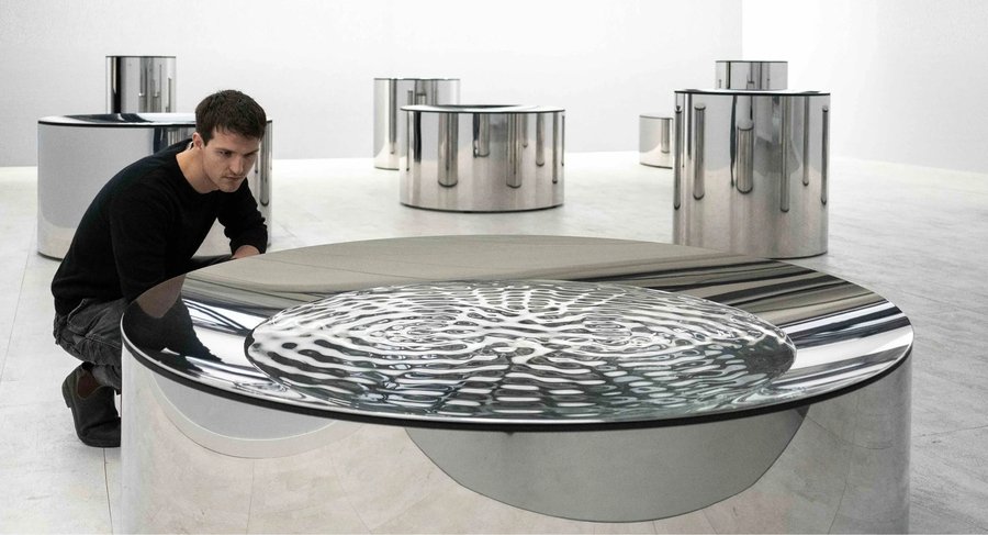 Другой важный проект — «Wavespace» (2023). В этой инсталляции бассейн с водой возбуждается акустическими волнами от 3 Гц до 90 Гц, и возникающие волны служат естественным оптическим экраном. Свет отражается и преломляется, формируя постоянно меняющиеся «картины жидкости». При этом показ сопровождается музыкой, что усиливает ощущение погружения и синестезии света и звука.