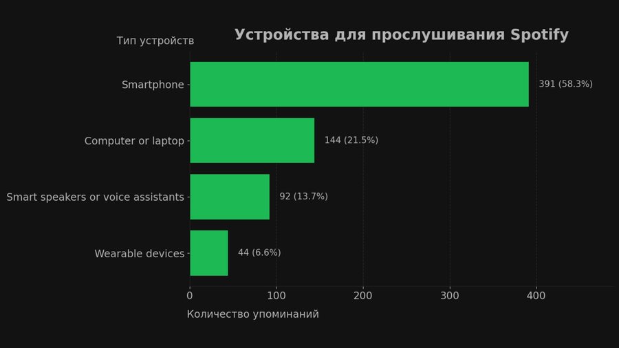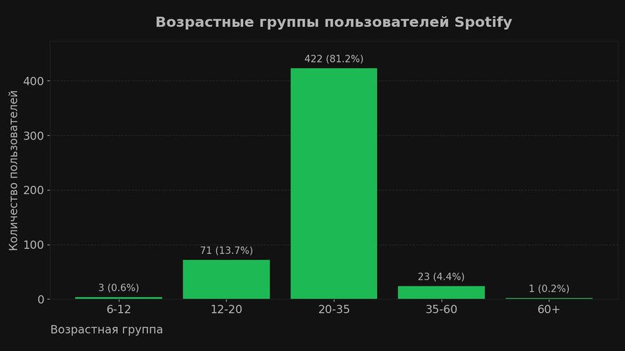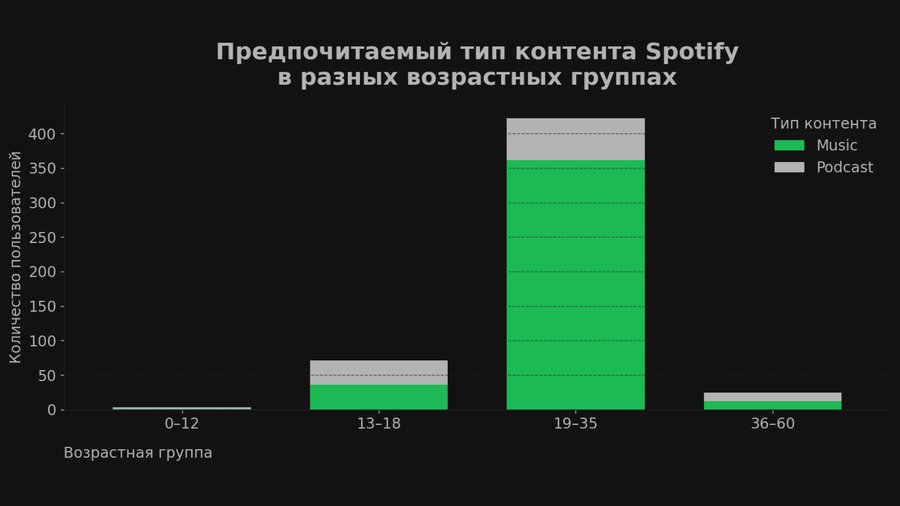 Анализ данных пользователей Spotify выявил, что основная аудитория платформы — это молодые люди в возрасте от 19 до 35 лет. Чаще всего музыку слушают на смартфонах, что говорит о предпочтении мобильного доступа к контенту. Пользователи, в основном, выбирают несколько определённых музыкальных жанров, при этом музыка популярнее подкастов среди всех возрастных групп. Возраст также влияет на то, как долго слушают музыку, особенно вечером и ночью. В целом, результаты показывают, что Spotify в основном воспринимается как музыкальная платформа, ориентированная на молодёжь и мобильное использование.