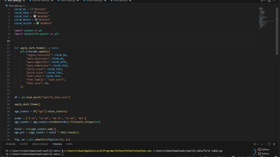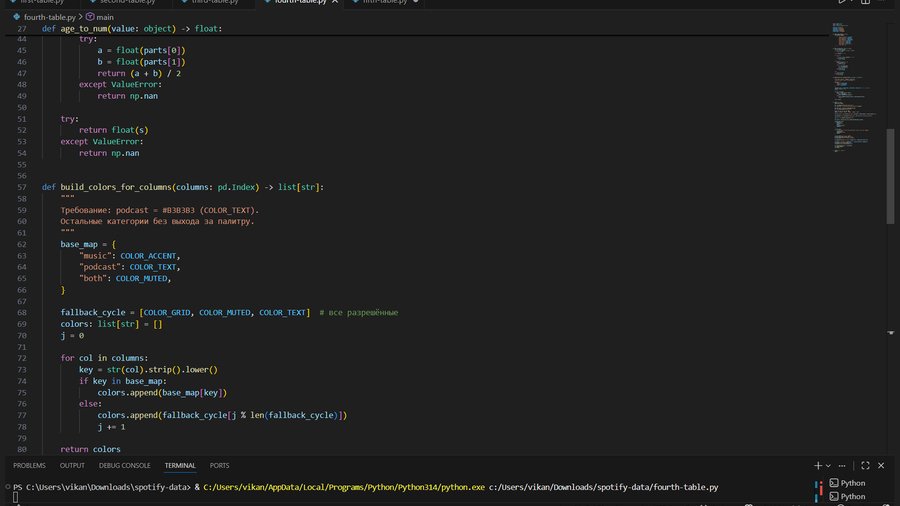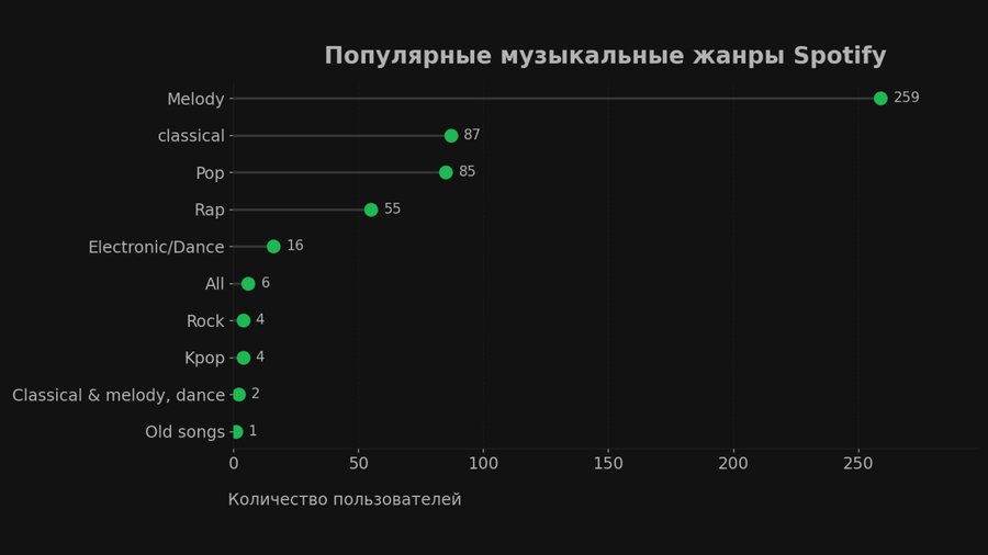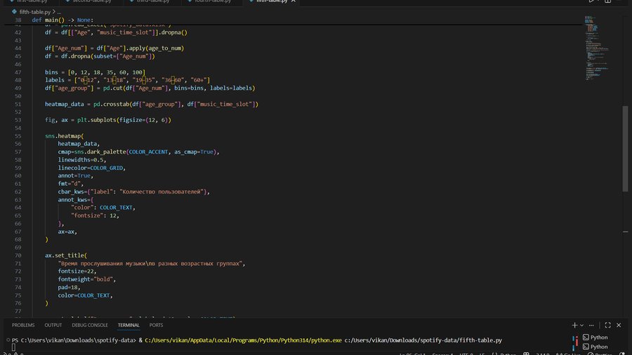 В рамках проекта я проанализировала данные о поведении пользователей Spotify, популярного музыкального сервиса. Целью было установить связь между возрастом, полом, настроением, привычками прослушивания и выявить закономерности взаимодействия людей с музыкой.
