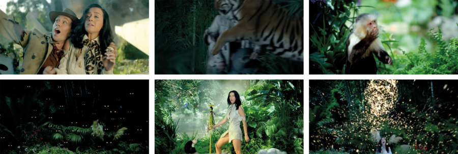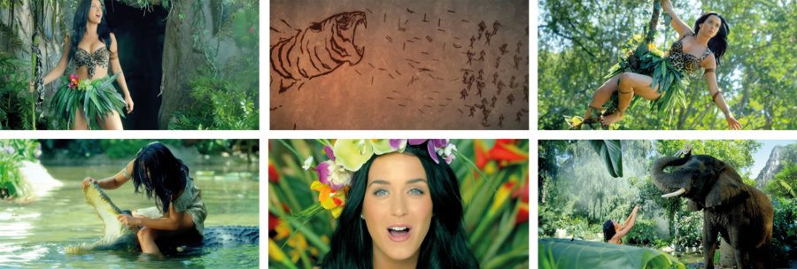 Сам по себе тигр в кадрах почти не появляется. Но он определяет драматургию, где героиня побеждает страх и перенимает образ хищника, становится им. Интересно, что клип полностью построен на архетипе кошки, но без прямого использования котов в кадре. В клипе зритель видит как Кэтти Пэрри превращается в фигуру большой кошки. Она учится рычать, пластика ее тела напоминает позы кошки, движения рук и плечей манерные. То есть она перенимает телесность кошки, а не просто костюм и макияж как Beyoncé. Крупным планом в кадре часто показывают глаза певицы как у хищника, золотые оттенки похожи на блеск кошачьей шерсти при солнечном свете. Четко прослеживается метафора от слабости к уверенности через кошачью пластику певицы.
