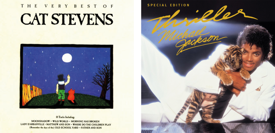 Обложки: The Very Best of Cat Stevens — Cat Stevens, 1990, Thriller (Special Edition) — Michael Jackson, 2001, Taming the Tiger — Joni Mitchell, 1998, Surfing the Void — Klaxons, 2010