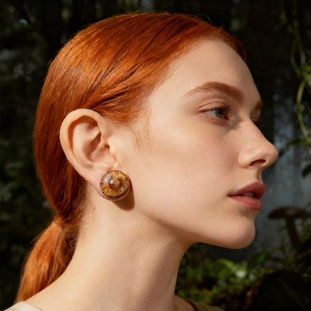 Кольцо вдохновлено грибом Favolaschia calocera, известным своей яркой окраской и характерной пористой поверхностью. В украшении эта текстура переведена в рельефную структуру, охватывающую палец, где ритм отверстий и выпуклостей формирует тактильную поверхность. Кольцо сохраняет ощущение органического материала, превращённого в носимую форму.