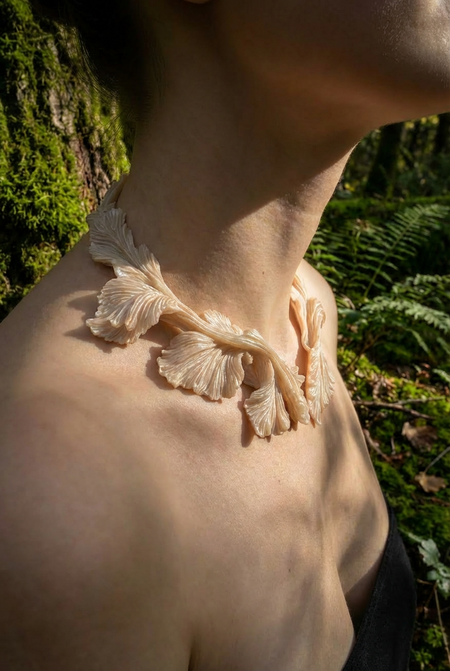 Колье основано на форме гриба Schizophyllum commune, известного своими веерообразными, многослойными пластинами. Его структура перенесена в украшение, которое располагается вдоль ключиц, повторяя линию шеи. Разветвлённые элементы создают ощущение лёгкой, почти кружевной поверхности, при этом оставаясь частью цельной скульптурной формы.