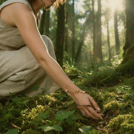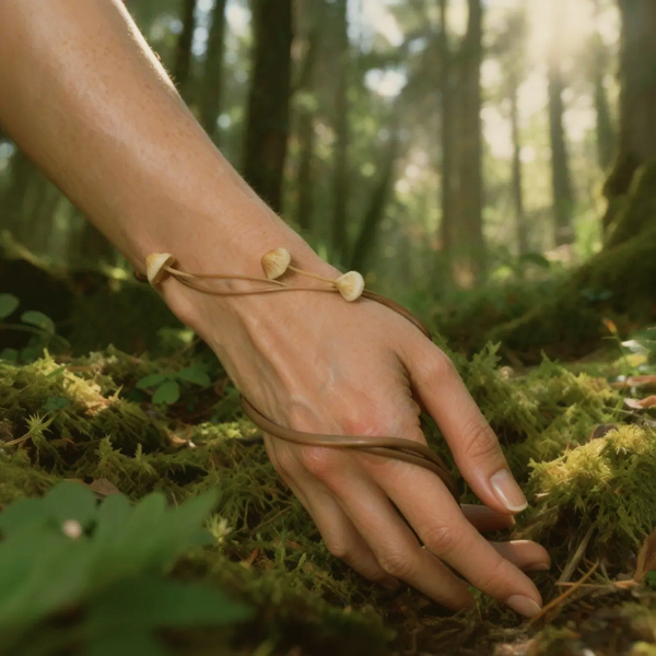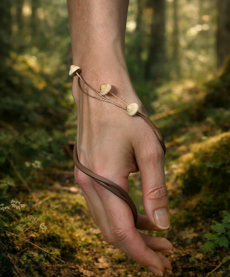 Браслет вдохновлён грибом Psathyrella corrugis, с его тонкими стеблями и вытянутыми шляпками. В украшении эти элементы формируют пучок, который обвивает запястье, как живой росток, растущий вокруг руки. Браслет выглядит как органическая структура, адаптированная к форме тела.