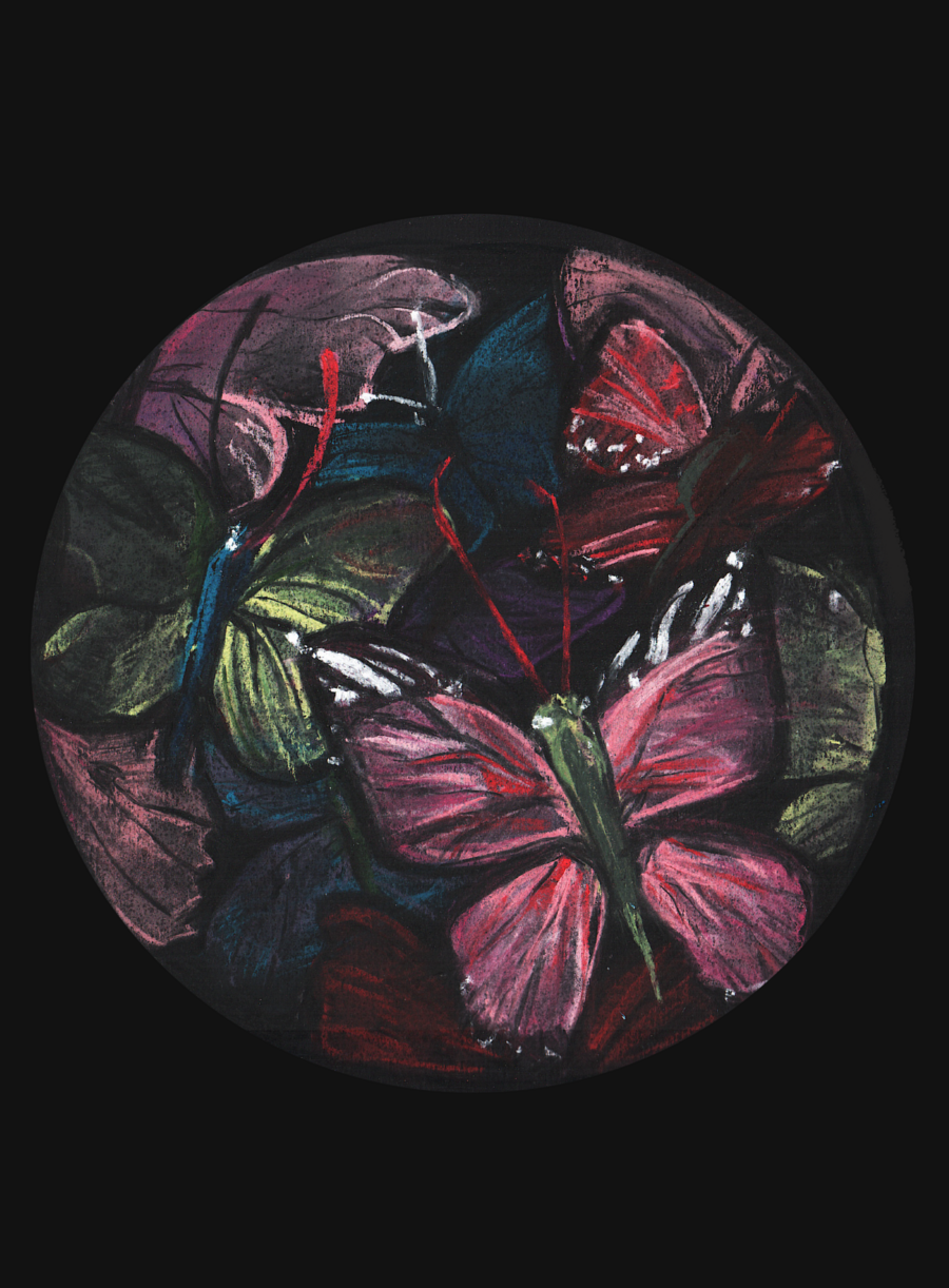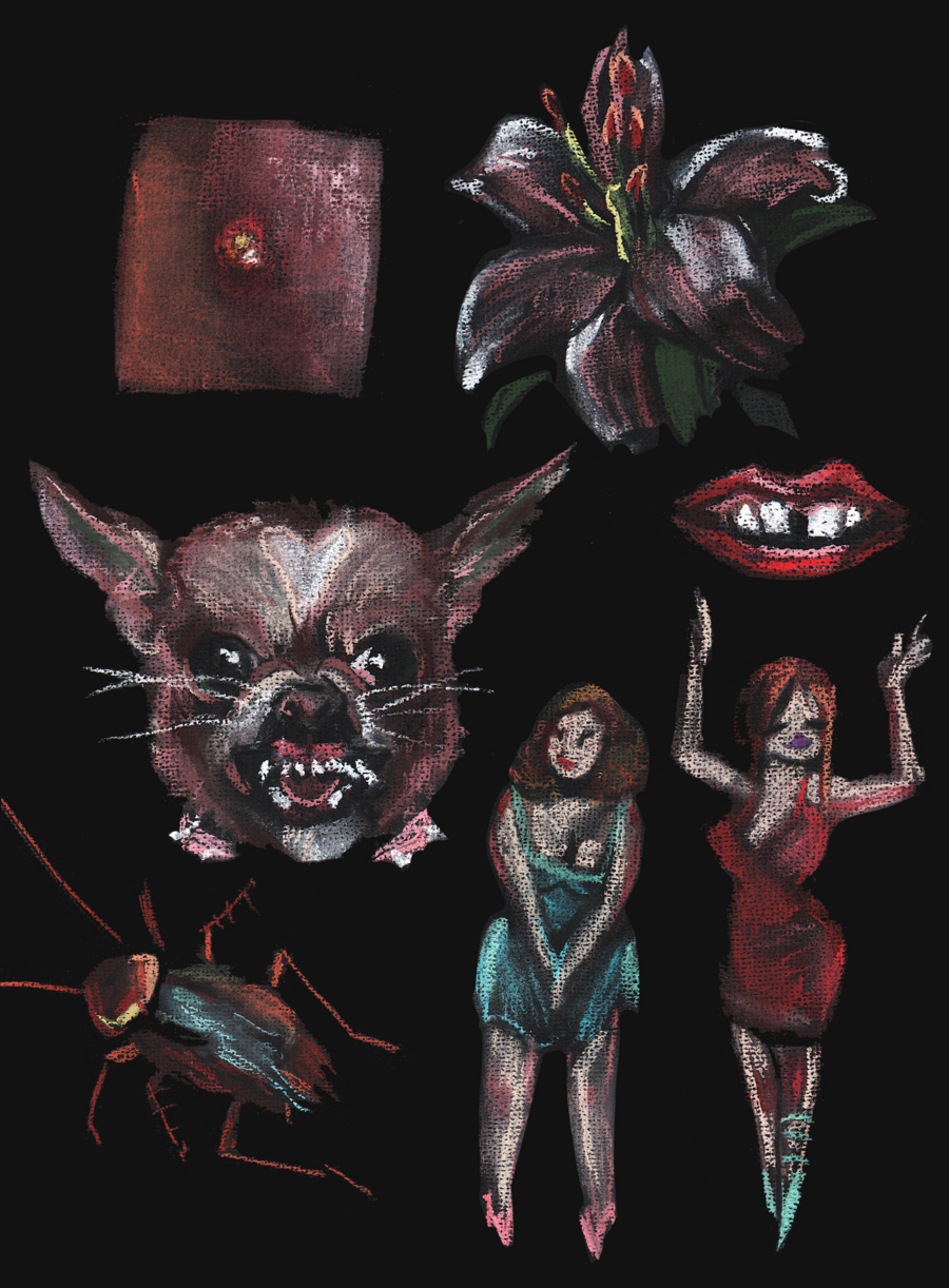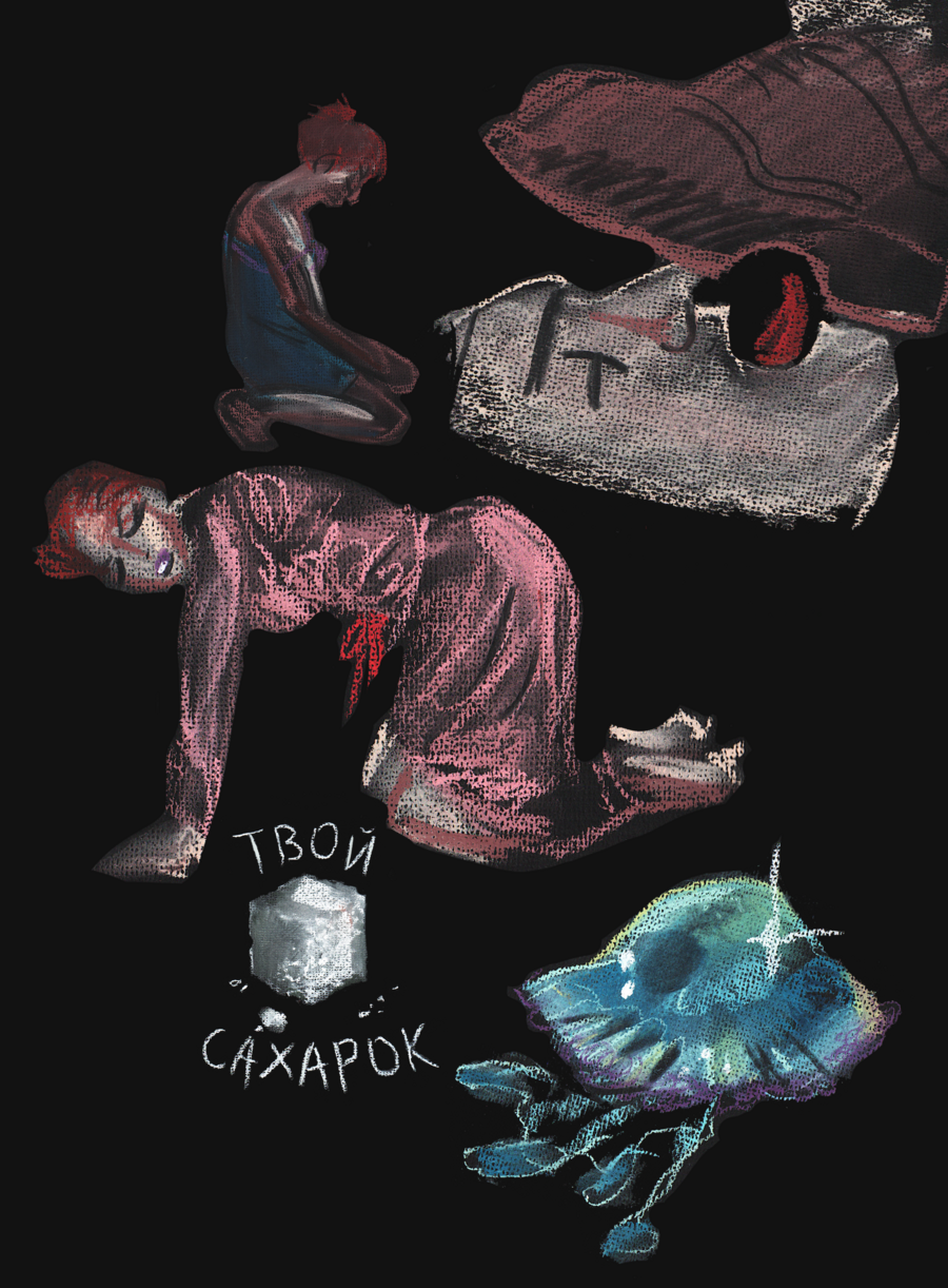 Иллюстрации выполнены сухой пастелью на черной бумаге высокой плотности. Часть картинок появилась в результе ассоциативного поиска визуала проекта.