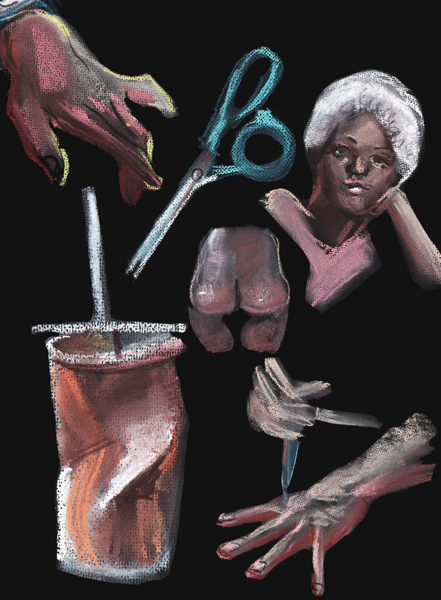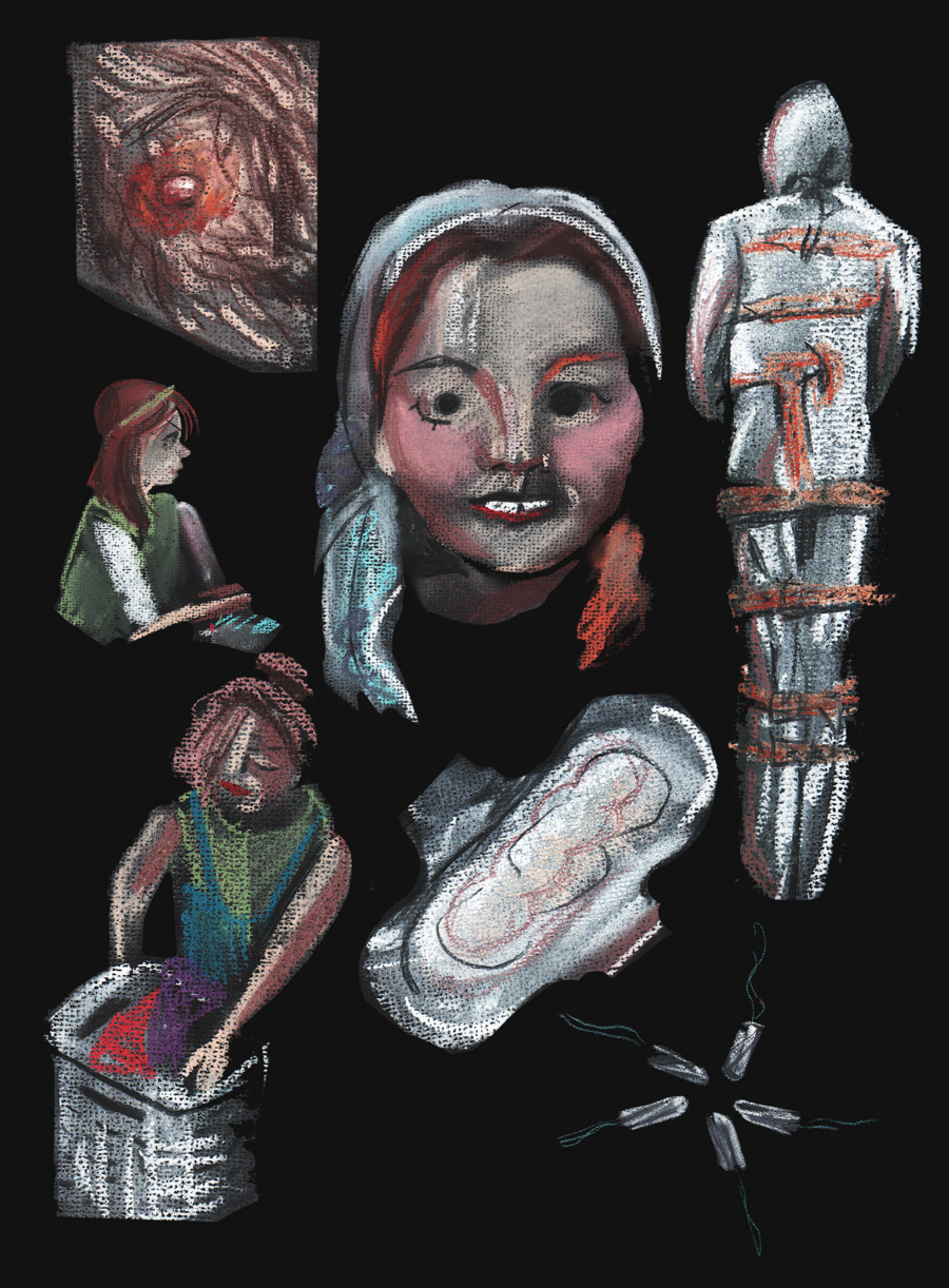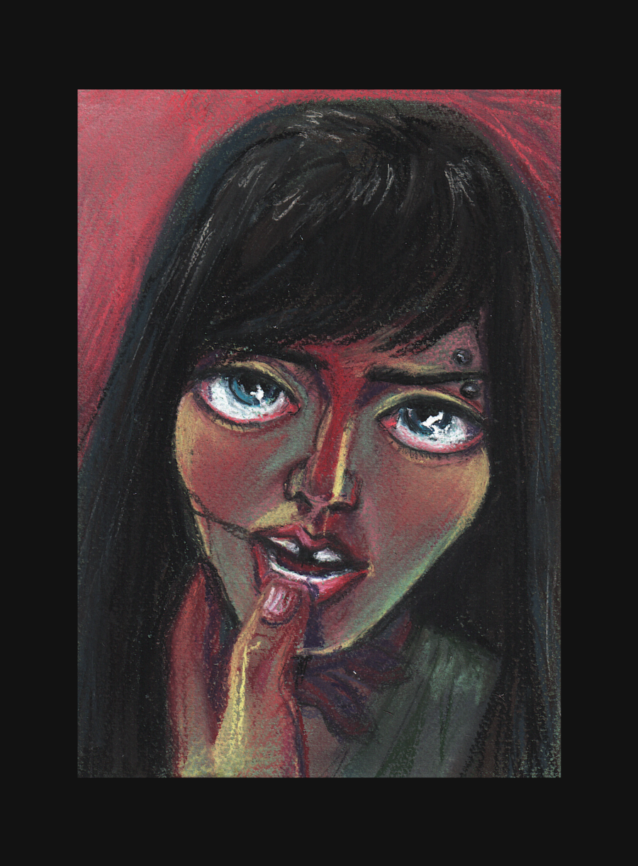 Иллюстрации выполнены сухой пастелью на черной бумаге высокой плотности. Часть картинок появилась в результе ассоциативного поиска визуала проекта.