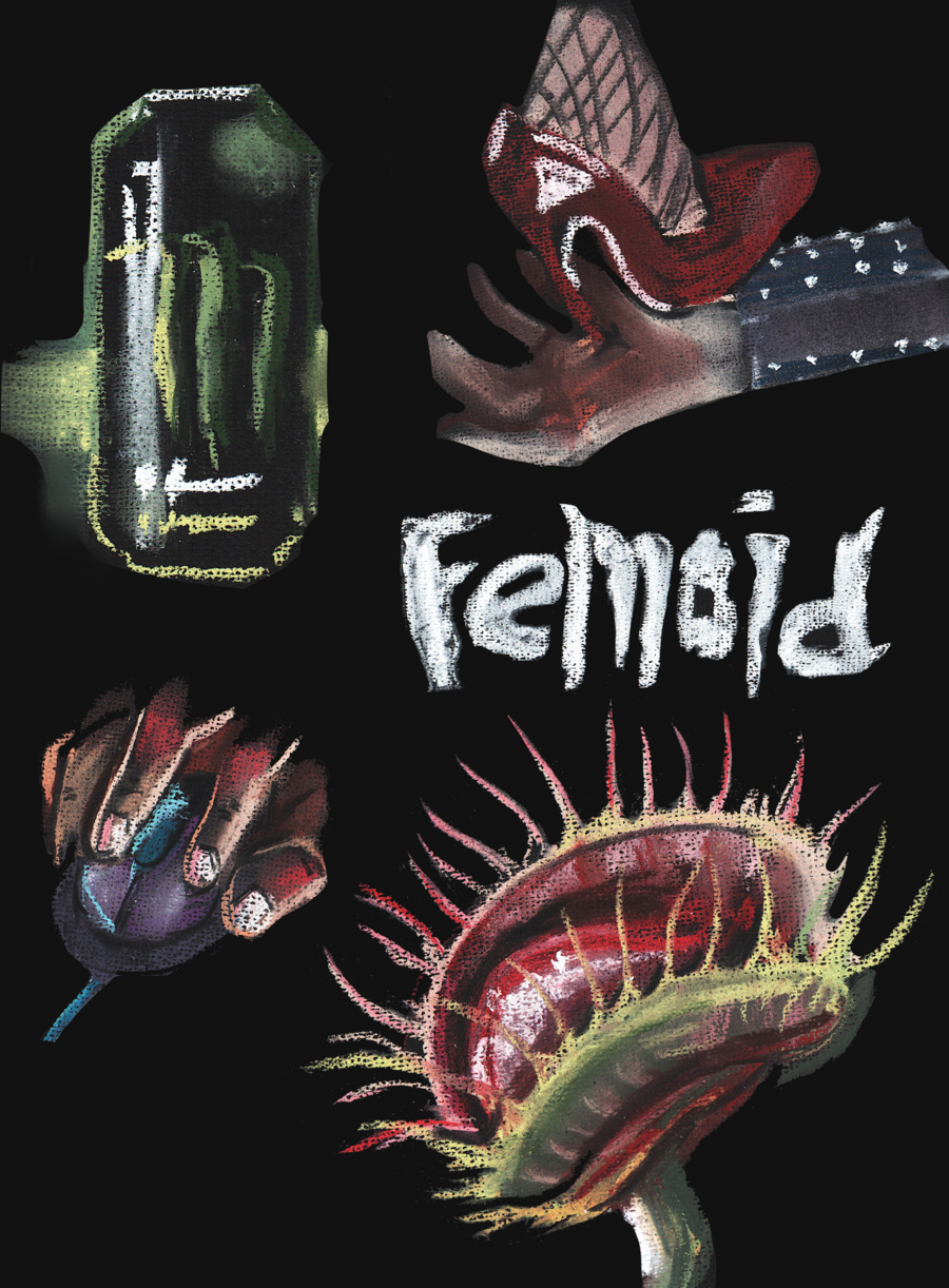 «Femoid» — линейка мерча, вдохновленная графической серией «Дырка» (ВКР). В нее вошел зин и набор пинов.