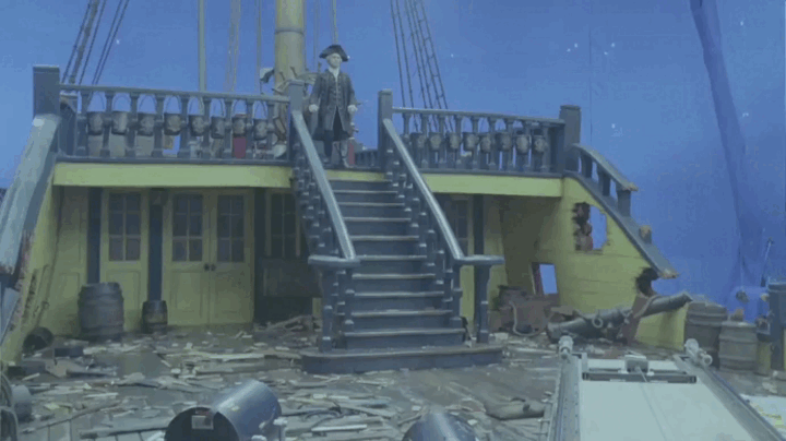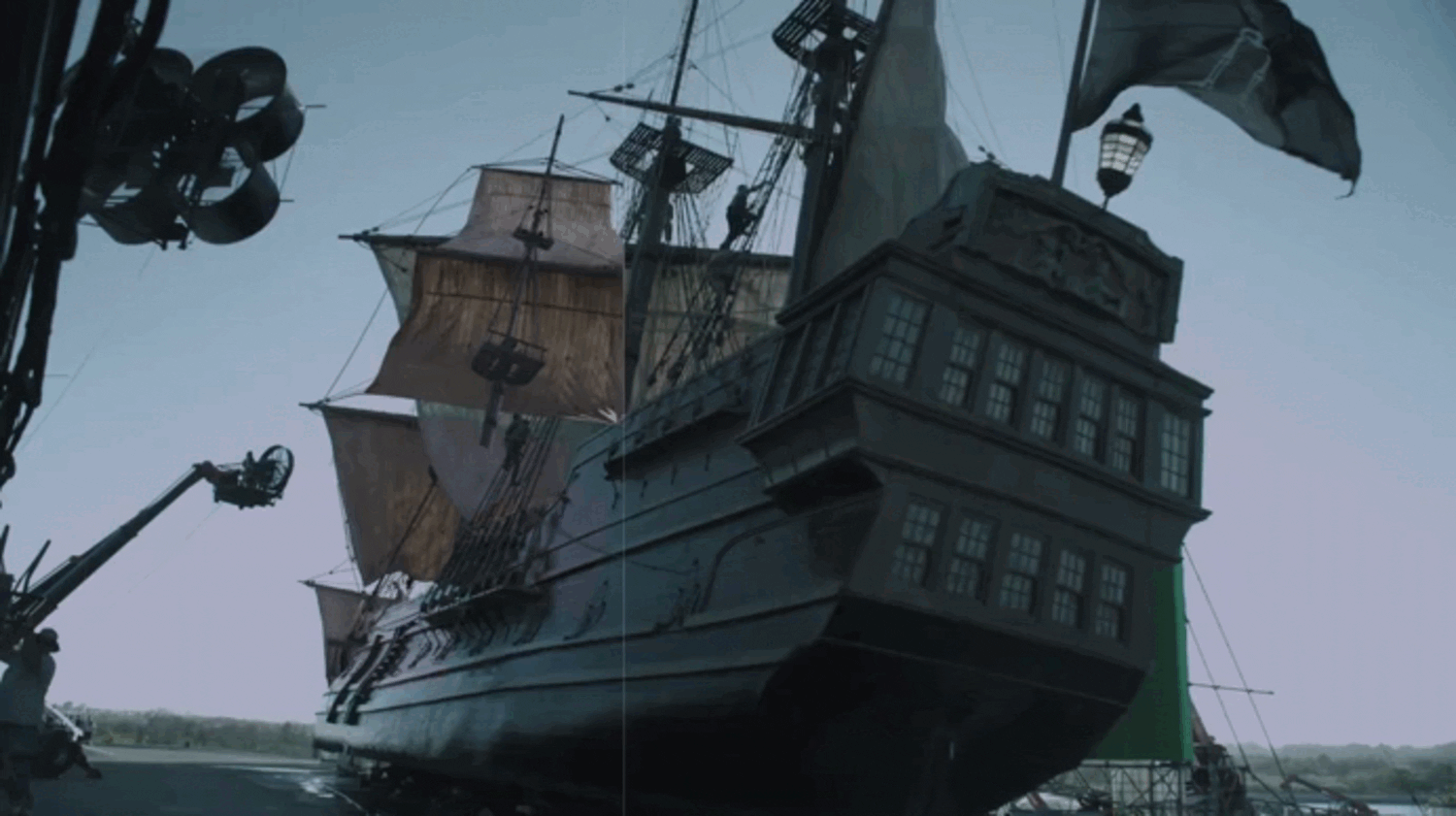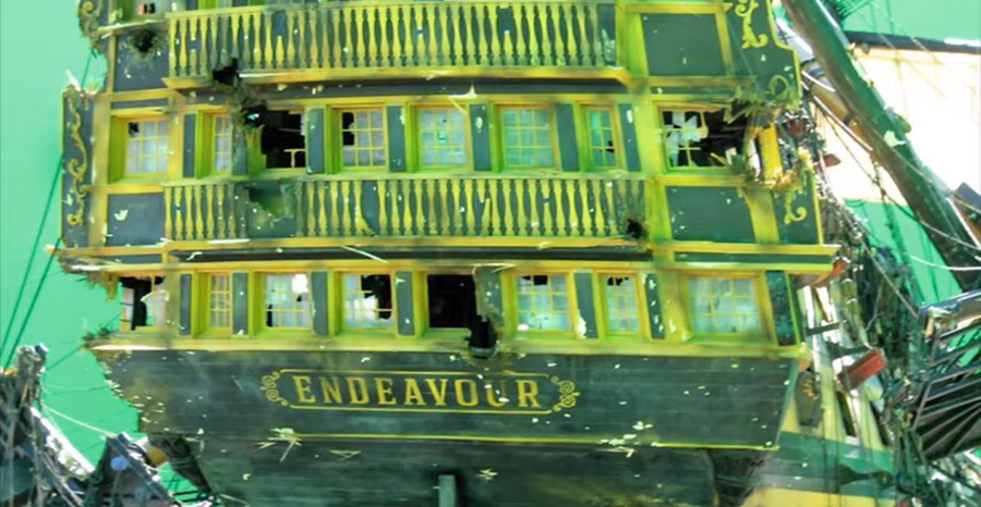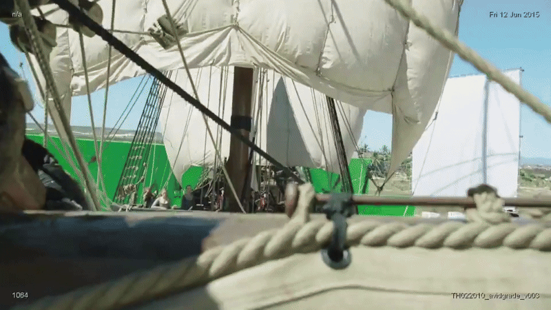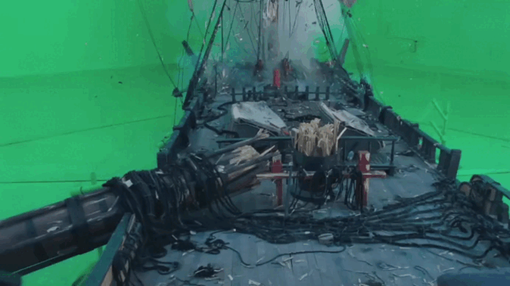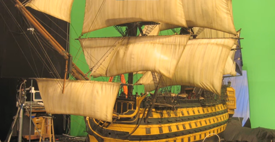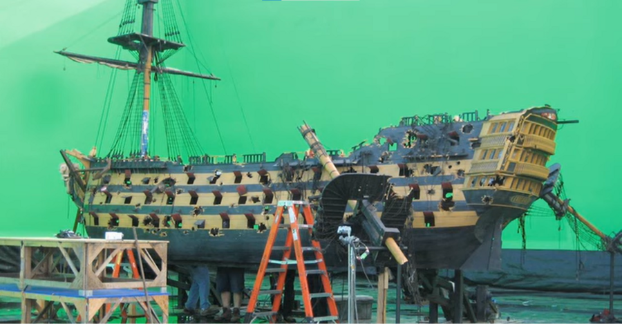 Но это не означает полноценный отказ от CGI для создания кораблей, более того, большинство судов всё ещё остаются смоделированными в 3D. Полноразмерные декорации облегчают работу актёров, позволяя им полноценно погрузиться в историю. Съёмки проходят в бассейнах с водой на киностудии в Кейптауне, корабли стоят на гимблах для имитации качки и кренов. Всё, что касается окружения, детализации и парусов, дорабатывается при помощи компьютерной графики. Сцены, где корабли показаны с высоты птичьего полёта, создаются полностью в 3D (тут мы видим отказ от макетов).