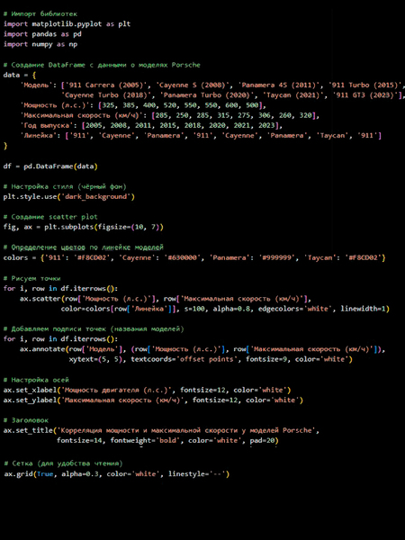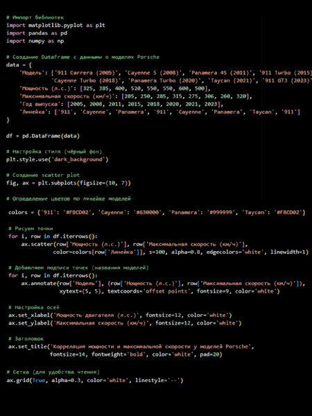 Я выбрала для анализа данные об автомобилях марки Porsche. Porsche для меня — это не просто машина, а символ инженерного совершенства, дизайнерского мастерства и страсти к скорости, где каждая деталь отражает многолетние традиции и инновации.