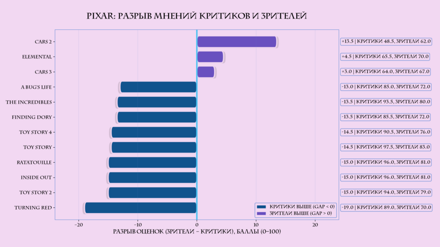 По графику видно, что в большинстве случаев критики оценивают фильмы Pixar выше, чем зрители. Ситуации, когда разрыв положительный (то есть зрители ставят выше критиков), встречаются существенно реже и представлены меньшим числом картин. В рамках этого датасета складывается устойчивое впечатление, что критическое сообщество в среднем более благосклонно к Pixar, чем массовая аудитория.