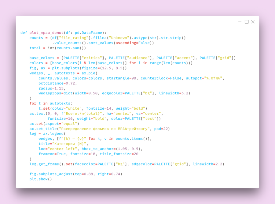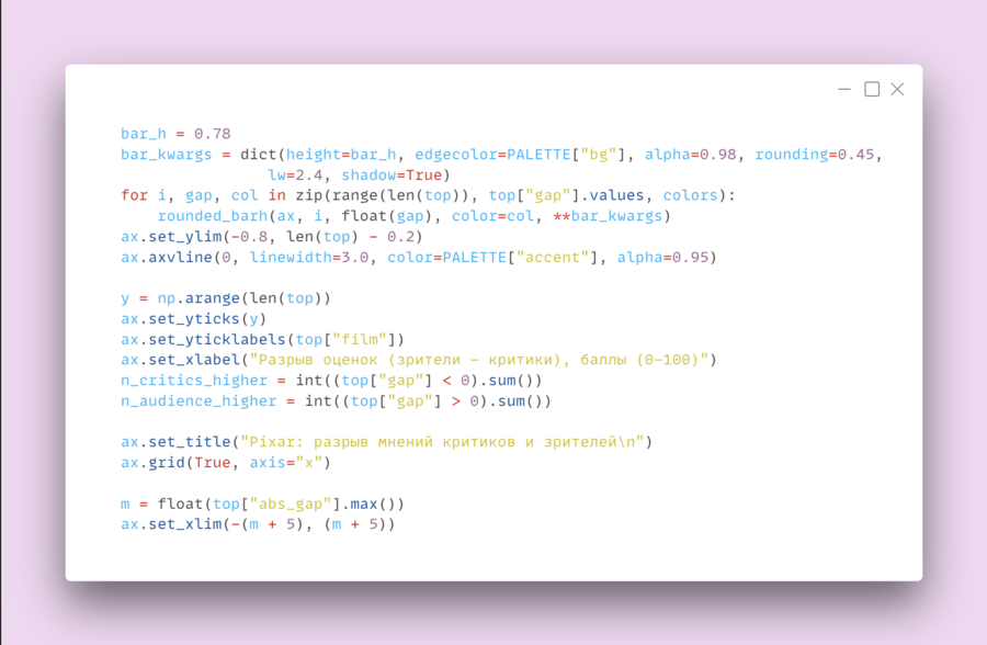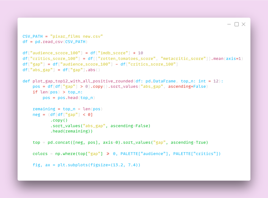 Далее загружается датасет из файла pixar_films new.csv в таблицу DataFrame (df). После этого рассчитываются несколько новых столбцов, которые нужны для анализа: оценка зрителей приводится к шкале 0–100 (audience_score_100 = imdb_score * 10), оценка критиков берётся как среднее Rotten Tomatoes и Metacritic (critics_score_100). Также высчитаем здесь разрыв мнений зрителей и критиков — gap, а также его модуль abs_gap, чтобы находить самые «спорные» фильмы независимо от знака.