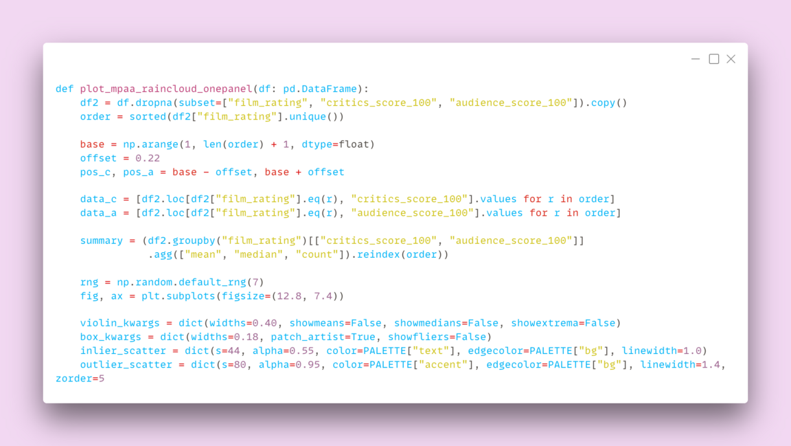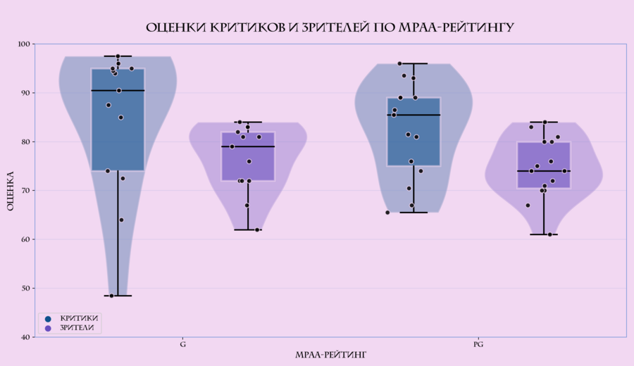 Следующий график, который я построила, показывает распределение оценок фильмов Pixar в зависимости от MPAA-рейтинга (G — все возраста, PG — 13+). Визуализация включает несколько слоёв. Полупрозрачное «облако» вокруг центральной части (violin) показывает форму распределения: где оно шире, там больше фильмов с такими значениями, а где уже — таких фильмов меньше. Прямоугольник внутри облака (boxplot) отображает основную зону значений, а линия внутри прямоугольника показывает медиану — наиболее типичную оценку в данной категории. Точки на графике обозначают отдельные фильмы, благодаря чему видно, насколько оценки внутри каждой группы однородны или, наоборот, сильно разбросаны. Чтобы распределения читались лучше, шкала оценок ограничена диапазоном 40–100, так как ниже этого уровня значений в данных практически нет. В данной выборке MPAA-рейтинг действительно связан с оценками: фильмы с рейтингом G в среднем и по медиане оцениваются чуть выше, чем фильмы PG, причём это видно и у критиков, и у зрителей.