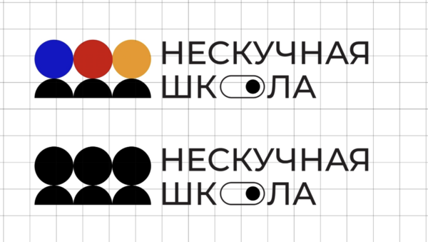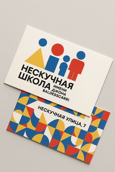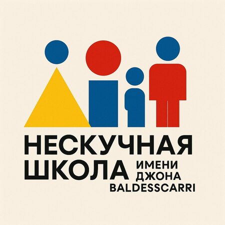 Промпт: сгенерируй логотип «нескучной школы» имени джона балдессари. используй шриф без засечек, кириллический текст, красный, желтый и синий цвета. лого должно включать геометрические формы и простые человеческие фигуры