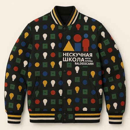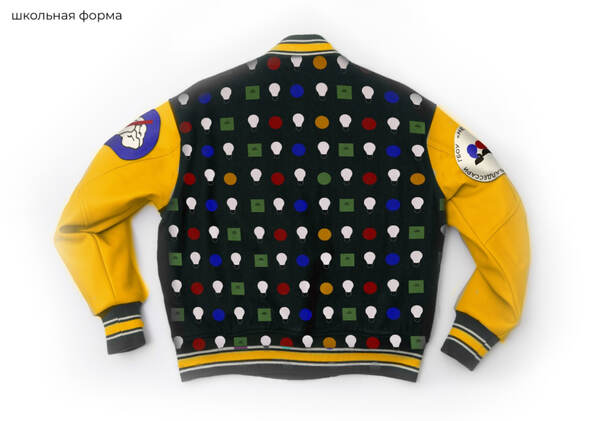 Промпт: создай школьный студенческий бомбер для учеников этой организации. на нем должен быть паттерн и логотип. референс формы — 3 изображение