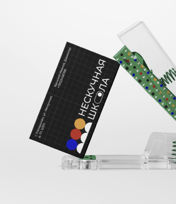 Промпт: а теперь сгенерируй визитку этой организации, используя этот логотип и контактную информацию. адрес: нескучная улица, 7. придумай геометрический паттерн, который будет подходить стилю организации и расположи его на визитке. это должен быть минималистичный мокап, визитка лежит на столе под углом