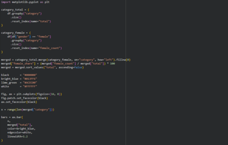 Анализ долей и структурных показателей — использовался при расчёте процентной доли женщин среди лауреатов в каждой категории. Это позволило выявить области с наибольшим и наименьшим уровнем гендерного разнообразия.