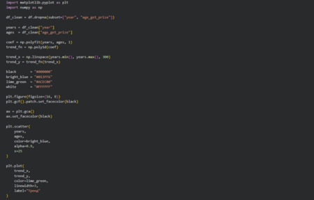 Трендовый анализ — выполнен путём аппроксимации данных линейной регрессионной моделью, что позволило выявить общую тенденцию изменения возраста лауреатов во времени.