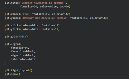Визуальный анализ взаимосвязей — реализован с помощью диаграммы рассеяния, отображающей зависимость возраста лауреатов от года получения премии. Такой подход позволил оценить характер связи между временным фактором и возрастом награждения.