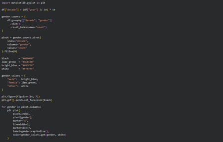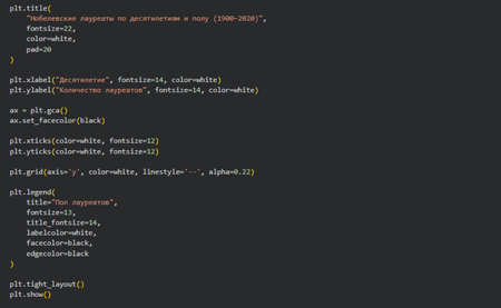 Анализ временных паттернов — реализован с помощью линейных графиков, отражающих изменение числа лауреатов по десятилетиям. Такой подход позволил выявить долгосрочные тренды и структурные сдвиги в гендерном распределении наград.