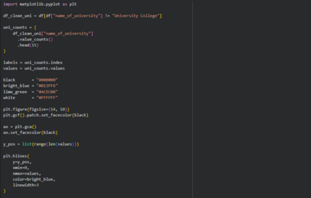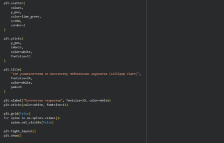 Анализ частотных распределений — реализован через lollipop-диаграмму, которая наглядно отразила различия между университетами и позволила избежать визуальной перегрузки по сравнению с классической столбчатой диаграммой.