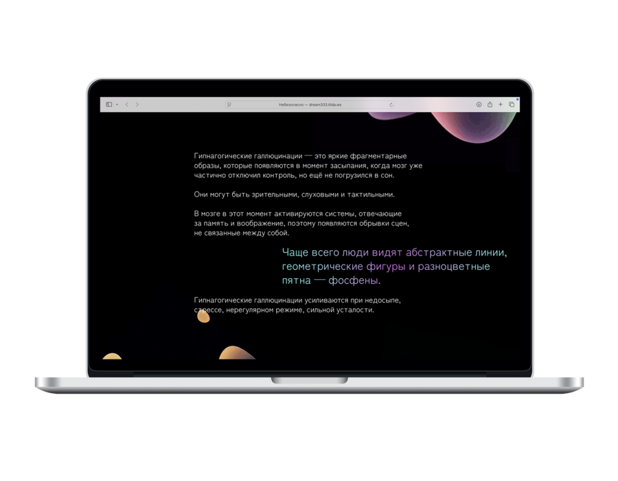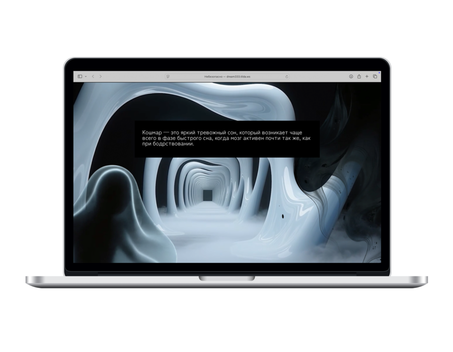 Визуальный язык лонгрида строится на контрасте чёрного фона и сюрреалистичных образов. Графика построена на плоских и объемных формах с градиентами и сгенерирована нейросетью.