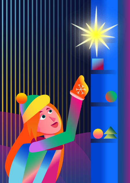 Яркий векторный стиль с насыщенными цветами и плавными градиентами перекликается с атмосферой Нового года — сиянием гирлянд, блеском ёлочных игрушек и переливами мишуры. Эти элементы создают ощущение праздничного света, словно каждая иллюстрация отражает разноцветные огни на новогодней ёлке.