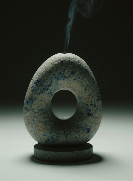 Prompt: Studio product photo of minimalist stone vase with through-hole, inspired by natural river pebble. Matte gray textured surface, soft studio lighting, pure white background. Three separate angles: front, ¾ view, top view. Ultra realistic, no plants, clean composition for premium catalog.