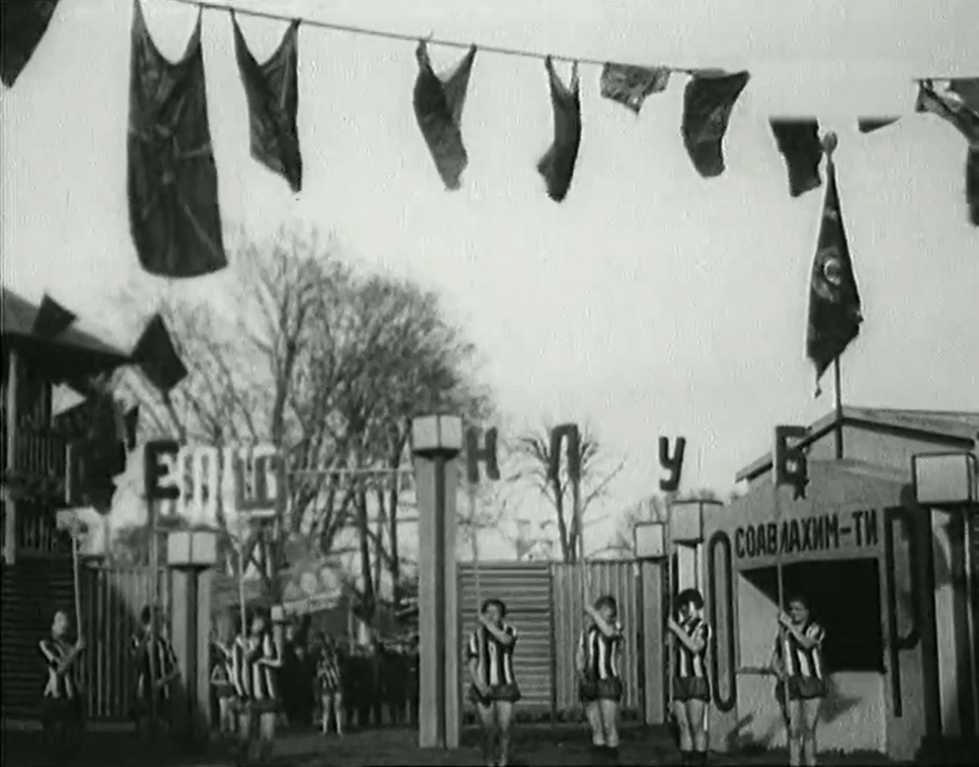 И, конечно же, нельзя не упомянуть характерный костюм раннесоветских физкультурников и физкультурниц. Спортивная одежда сама по себе является авангардным явлением, она практически символизирует конструктивистские принципы утилитарности. Юноши и девушки зачастую одеты в короткие шорты и футболки, на экране то и дело мелькают «соколки» — узнаваемая поперечная полоска.