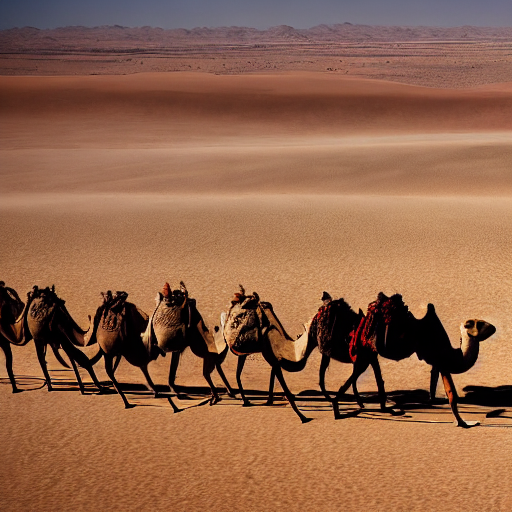 После обучения была проведена генерация 20 финальных изображений с помощью Stable Diffusion v1.5 и подключённой LoRA-модификации. Использовались промпты, описывающие разные состояния пустыни: «a wide-angle shot of golden desert dunes under clear sky» «sunset view over a desert with glowing sand and shadows» «minimalistic desert scene with soft dunes and gentle light» «a caravan of camels crossing the desert» «desert oasis surrounded by palms and water reflections» «artistic oil painting of a desert with dunes and rocks» «vast desert under starry night sky» «wind creating flowing sand patterns on dunes» «dramatic desert cliffs at golden hour» «a lone wanderer in the middle of the desert»