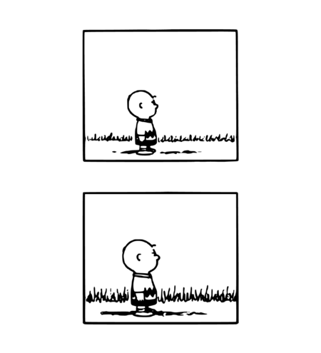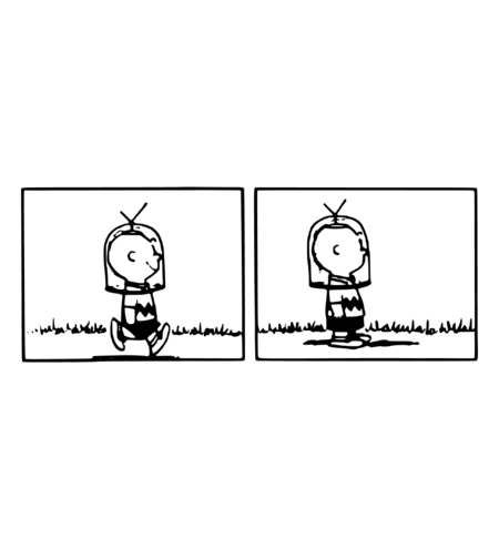 Одним из главных приёмов Шульца становится центрирование героя Чарли Брауна. Он часто помещён точно в середину панели: открытый, уязвимый и словно лишённый защиты. Такое расположение заставляет зрителя смотреть прямо на его беспомощность: вокруг нет ничего, что могло бы отвлечь внимание или поддержать героя. Поэтому центр кадра постепенно превращается в символ его внутренней хрупкости, а неподвижность фигуры в наглядное выражение того, как он застревает в своих переживаниях.