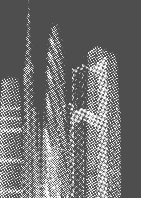 Динамичная иллюстрация из высотных зданий и небоскребов. При наложении точечного рисунка образуется муарный орнамент, который складывается в интересный образ пространства для работы и вдохновения.