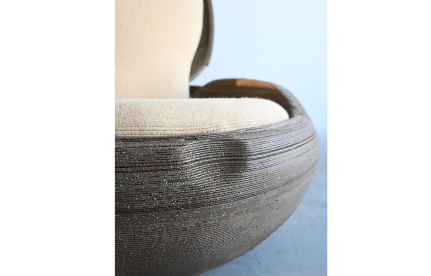 Поверхность стула всегда различается: где-то мицелий разрастается плотнее, где-то остаётся более рыхлым, создавая тонкие перепады и пористые участки. Эти «несовпадения» не исправляются, потому что они — часть идеи. Технологический след (слои печати) соединяется с биологическим следом (структура мицелия), и объект становится документом взаимодействия материалов, а не итогом контроля.