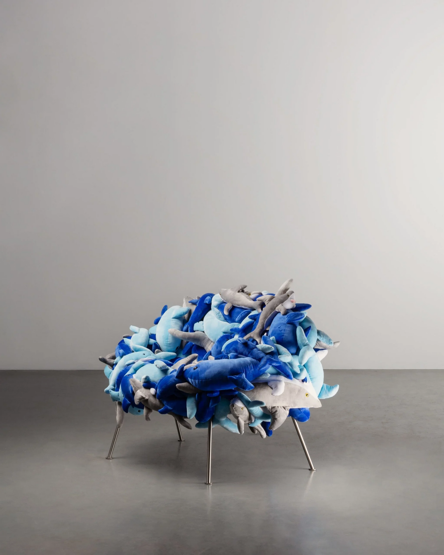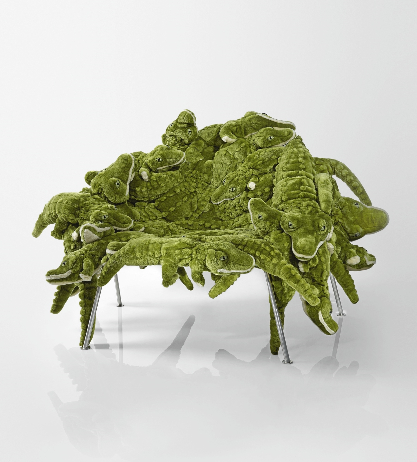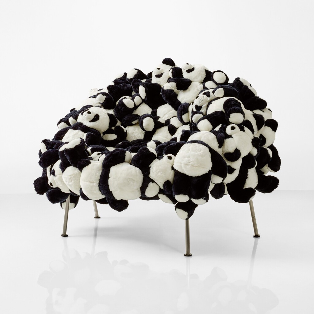 В серии Banquete на стальной основе собираются десятки плюшевых игрушек: мягкие звери облепляют кресло плотным слоем, и уже непонятно, сидим ли мы на мебели или на свалке детских вещей.