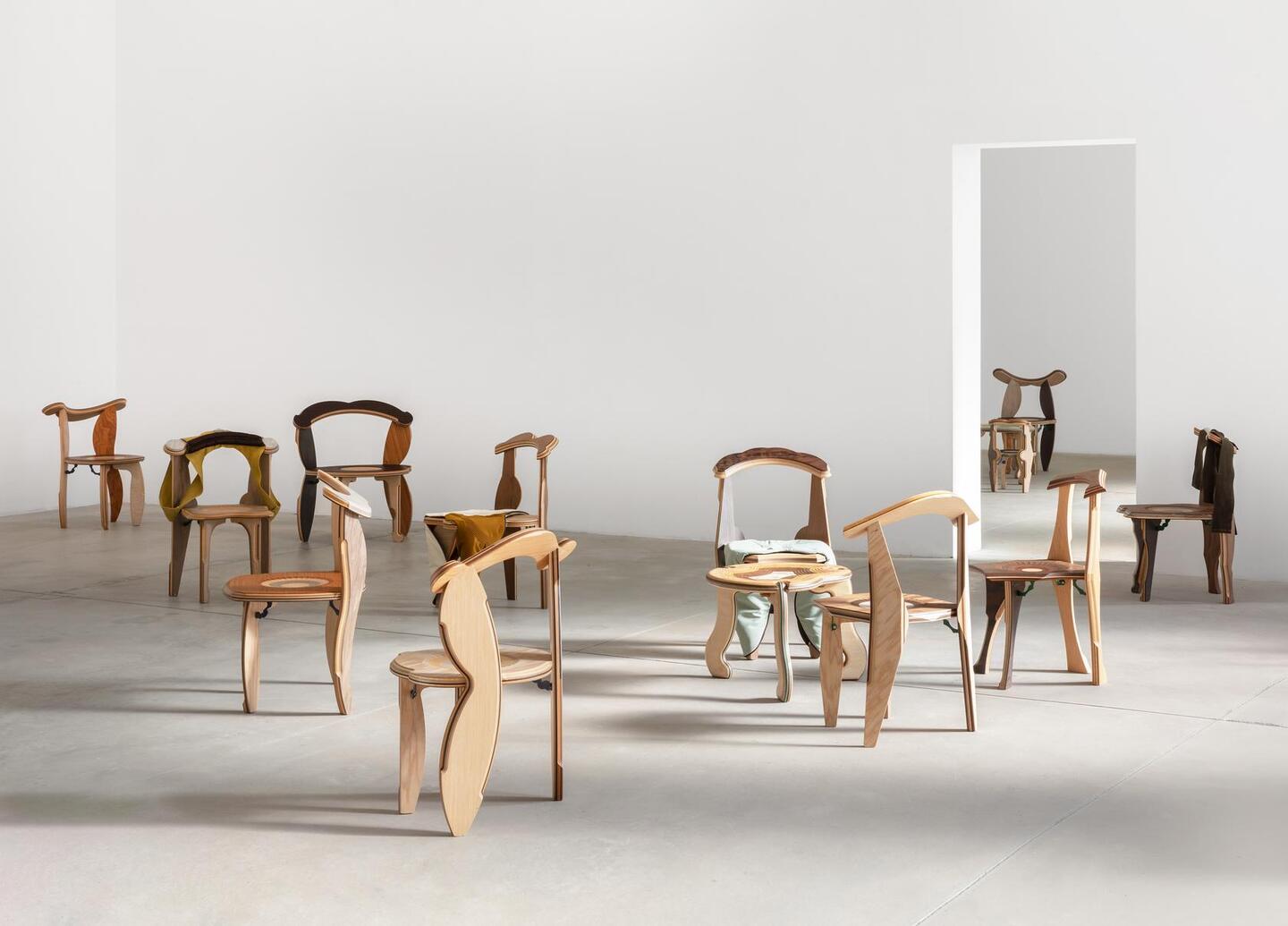 На выставочных фото видно, как в одном стуле соседствуют пластиковая спинка от офисного кресла и деревянное сиденье из школьной мебели, в другом — сразу несколько каркасов, «насаженных» друг на друга. Получается поле из сотни разомкнутых типологий: стандартный стул перестает быть невидимым фоном и вдруг оказывается носителем длинной истории использования.