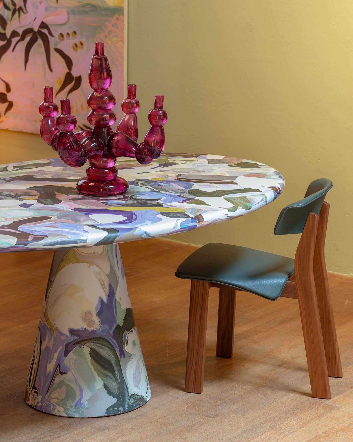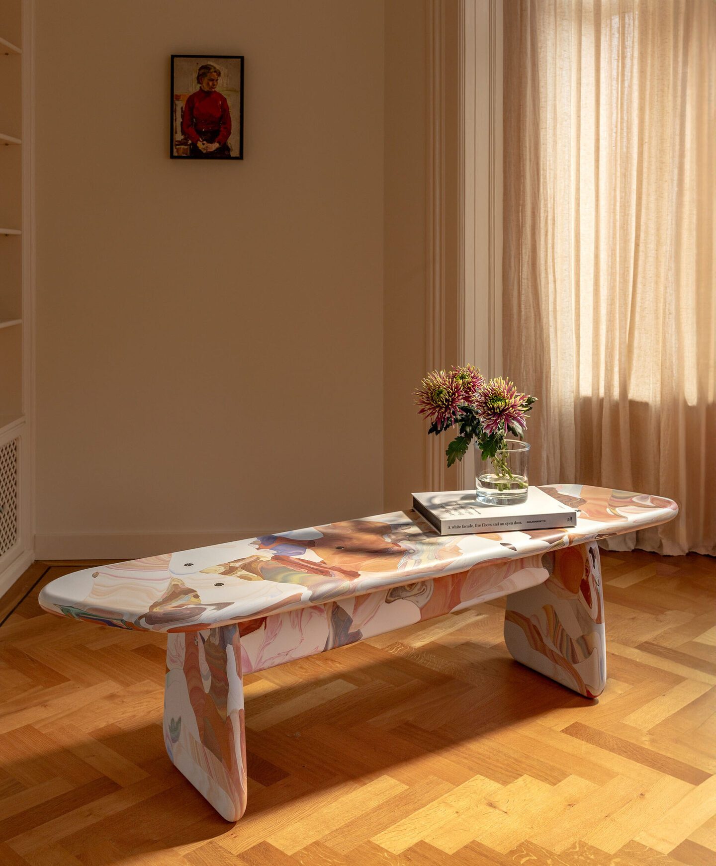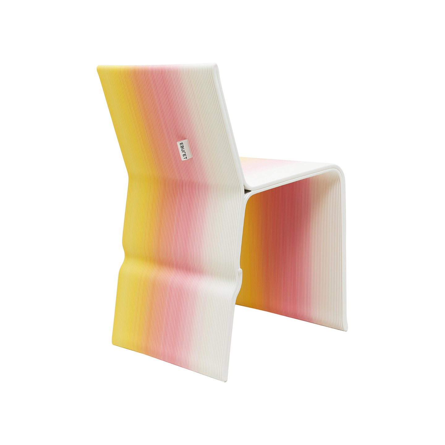 Поверхность предметов намеренно не шлифуется: видны характерные полосы слоями, небольшие комки и гранулы, ритм экструзии. В креслах и табуретах Eburet пластик ведёт себя как вязкая, живая субстанция: он не стремится быть похожим на дерево или металл, а демонстрирует собственную материальность.