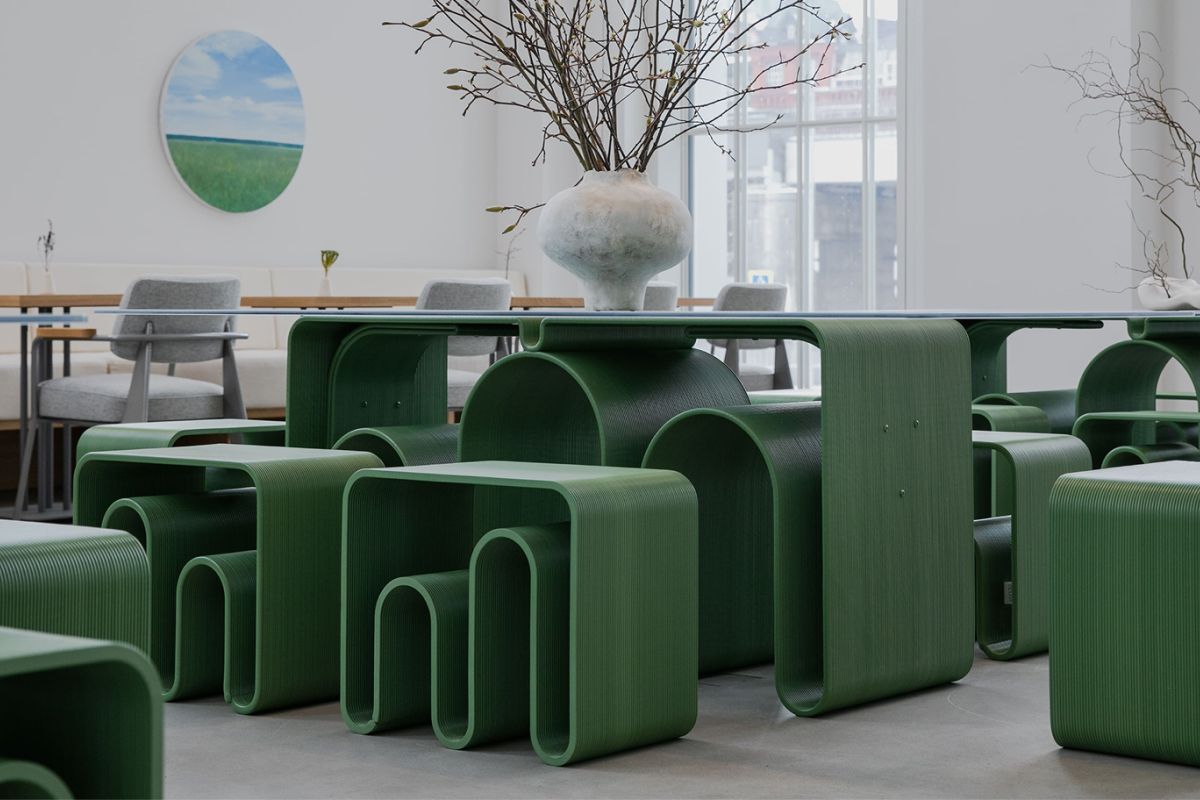Третье направление — технологическая переработка: 3D-печать, прессованные плиты, цифровая работа с отходами. Здесь форму диктует само поведение вторичного сырья: ритм слоёв, включения, текучесть расплава. Такой дизайн использует непредсказуемость материала как источник визуальной выразительности.