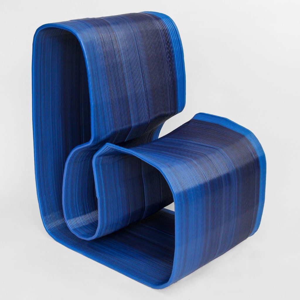 Работы Дирка ван дер Куйя — ещё один яркий пример. Его стул Endless печатается из переработанного ABS-пластика, плавленного в длинную мононить, которая затем наматывается в объём. Линия печати становится не скрываемой, а ключевой визуальной характеристикой. Стул будто построен из одного непрерывного жеста.