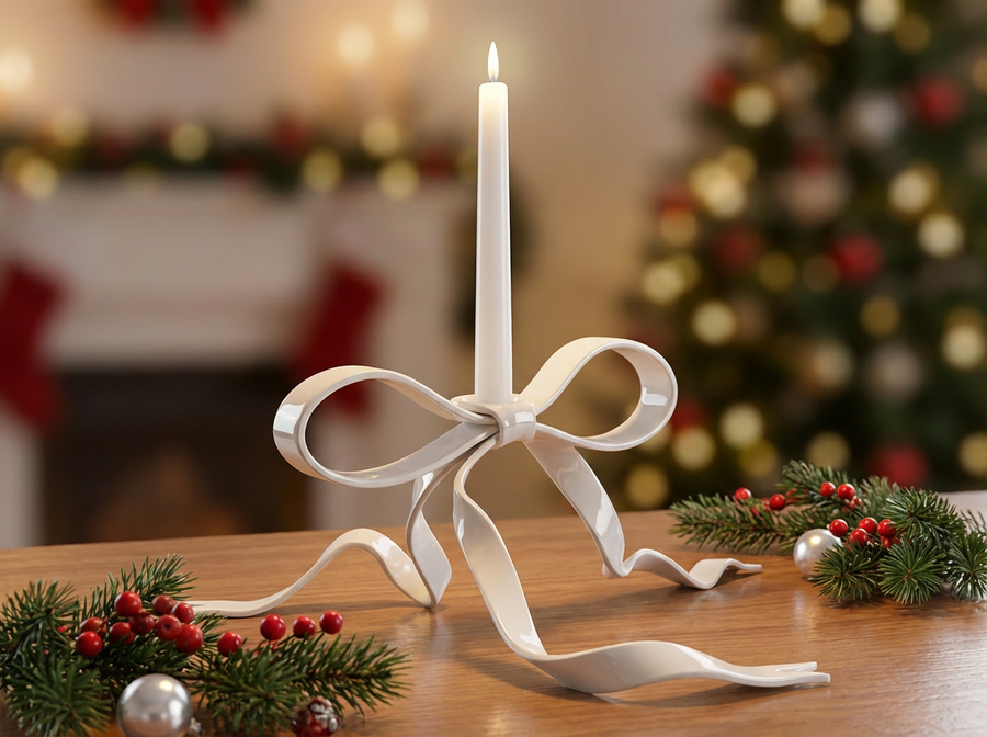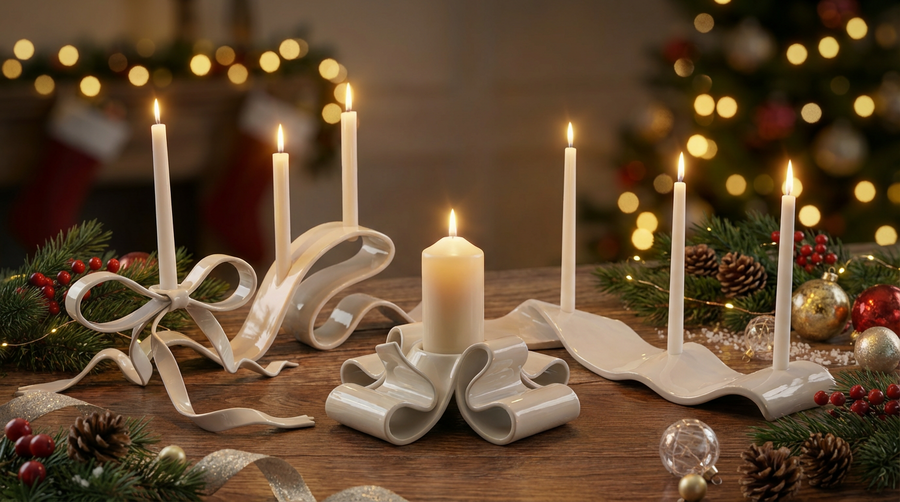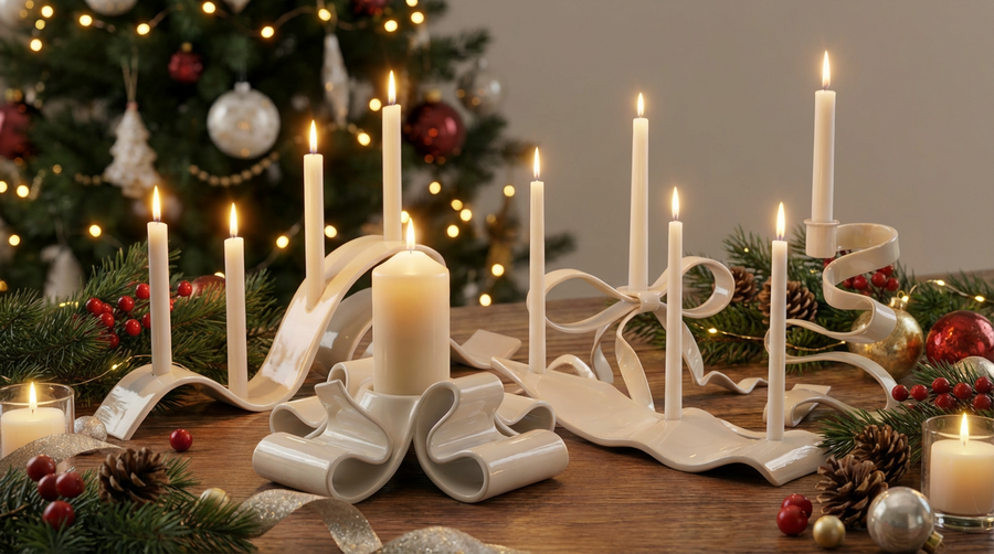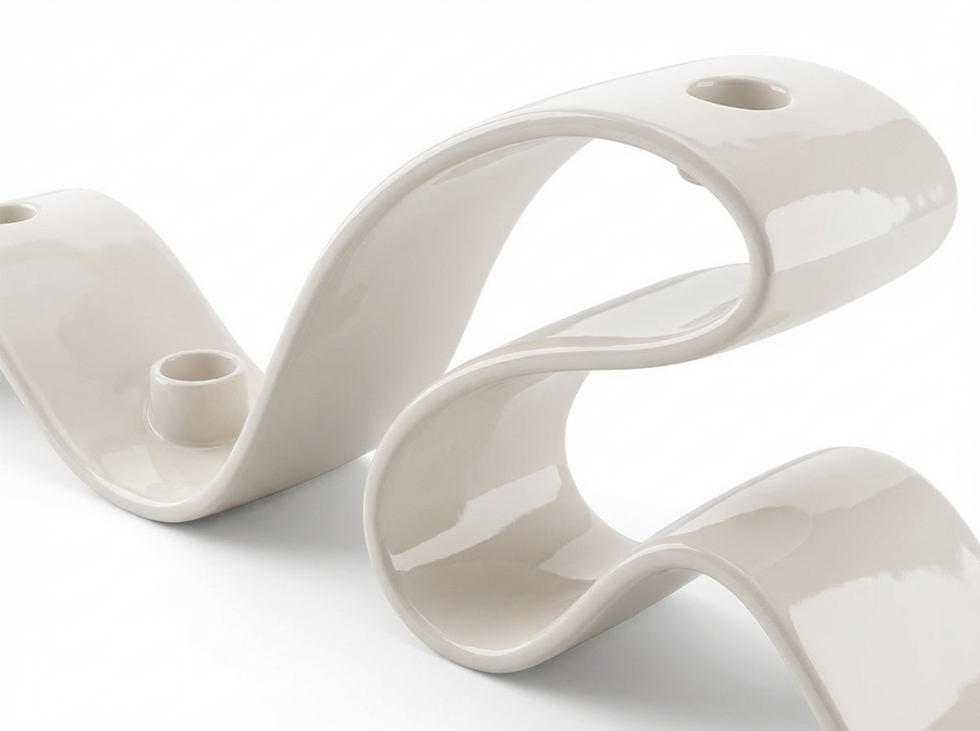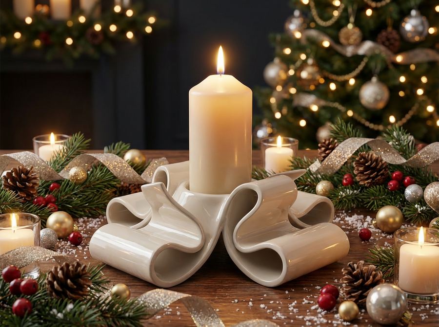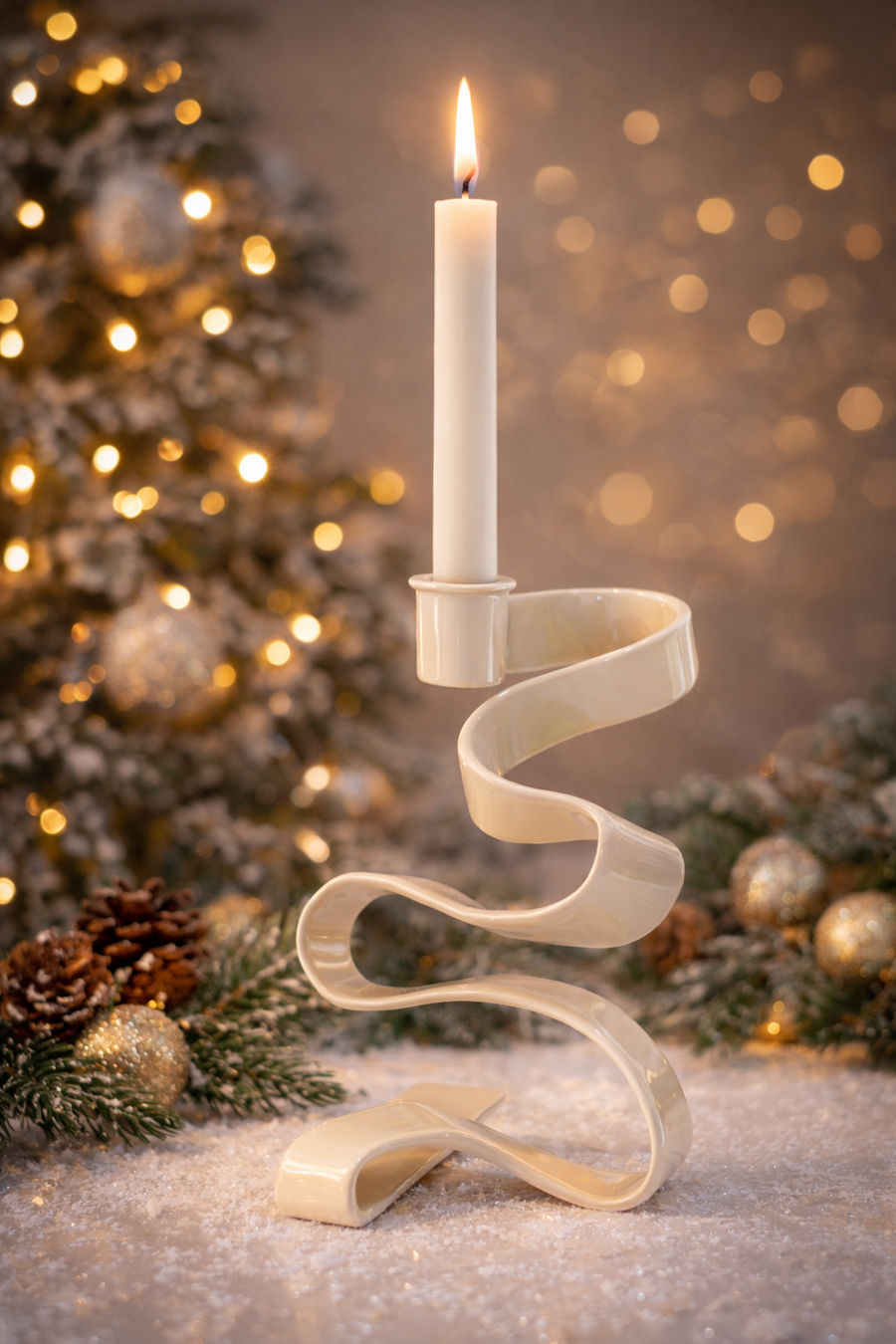 Наименование: новогодняя коллекция подсвечников «Ribbon Glow». Назначение: декоративные подсвечники для праздничной сервировки и интерьера. Состав серии: 5 изделий («Unwrap», «Wave», «Knot», «Bow», «Curl») Стиль: пластика «лента/серпантин», минимализм, молочный цвет. ➁ Технология и материал