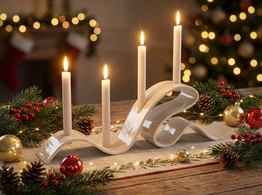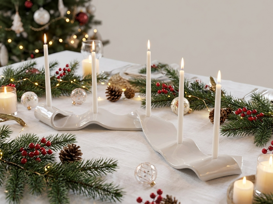 Молочный оттенок делает объекты универсальными: он поддерживает тёплое пламя свечи, не перетягивая внимание, и гармонично вписывается как в новогоднюю сервировку, так и в спокойный интерьер после праздников.