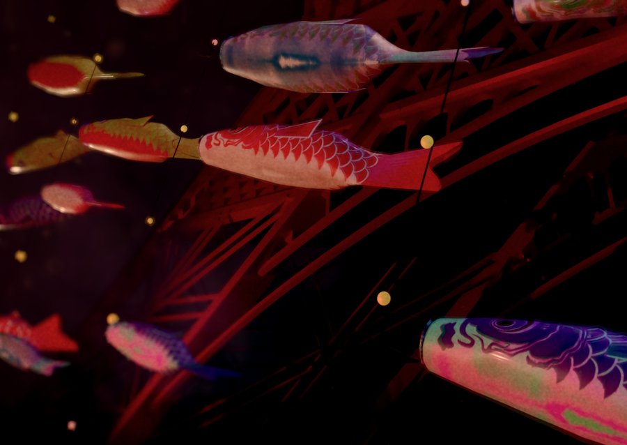 Бумажные карпы, развевающиеся на ветру во время ночного фестиваля, словно ожившие духи реки, плывут по тёмному океану воздуха.