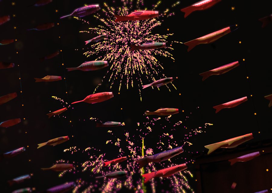 Проект представляет собой имитацию движения бумажных карпов коинобори в ночном небе с использованием Vellum симуляции.