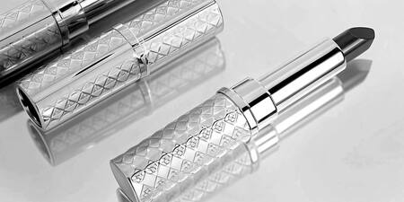 High-end luxury beauty shot: elegant metallic lipstick tubes with intricate quilted embossing, arranged on a glossy reflective surface. One lipstick open, revealing a sleek dark bullet. Ultra-detailed macro photography, bright diffused lighting, chrome and silver tones, modern premium aesthetic, crisp reflections, refined composition