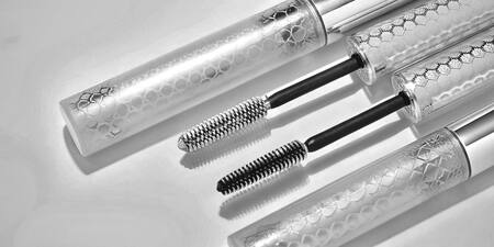 High-end luxury beauty shot: elegant metallic mascara tubes with intricate quilted embossing, arranged on a glossy reflective surface. One mascara open, revealing a sleek dark bullet. Ultra-detailed macro photography, bright diffused lighting, chrome and silver tones, modern premium aesthetic, crisp reflections, refined composition