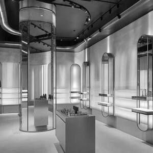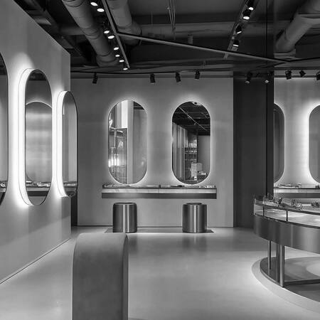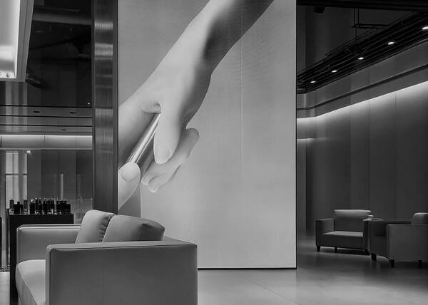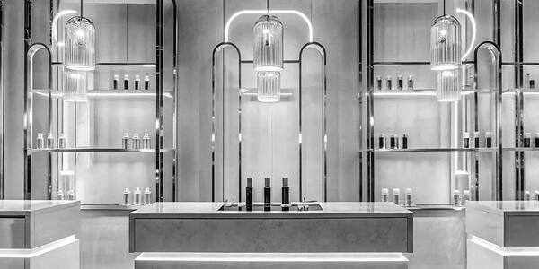 Promt (на все 4 изображения был единым): Luxurious niche cosmetics boutique interior with a modern minimalist aesthetic. Soft diffused lighting, polished marble floors, matte white walls, and sleek metallic accents. Elegant shelving with high-end skincare and makeup displayed like art pieces. A central island with reflective surfaces, subtle ambient glow, and sculptural decor elements. Clean lines, spacious layout, premium materials, and a serene, exclusive atmosphere