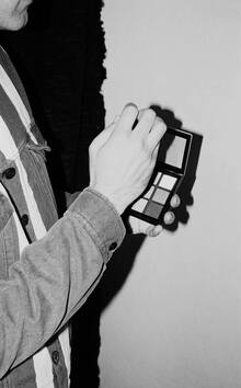Promt: generate a close-up photo of a realistic image of a man’s hand holding an eyeshadow palette against a neutral background. The mood is respectable and expensive, the lighting is spotty and bright