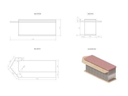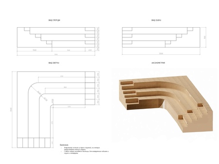 - Амфитеатр состоит из трехх ступеней, на которых предусмотрены мягкие сидушки. - С обеих сторон находятся лестницы для комфортного подъема и спуска и платформы. - Полки крепятся к стене, а так же опираются о ножки на полу. - Форма выполнена из гнутого дерева.