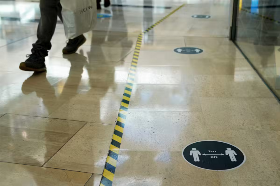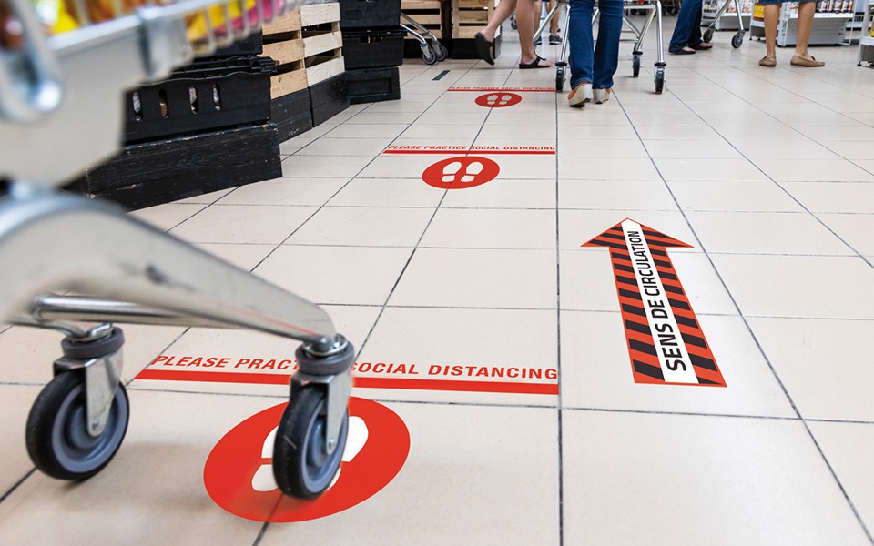 Разметка дистанции стала одним из центральных элементов графического языка пандемии и присутствовала практически везде: на полах магазинов, в офисах, школах, общественном транспорте, парках, подъездах и даже на уличных площадках.