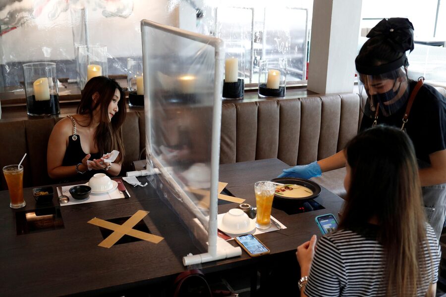 Сотрудники соблюдают социальную дистанцию во время обеденного перерыва на заводе Renesas Semiconductor Co. в Пекине, Китай, 2020 г.