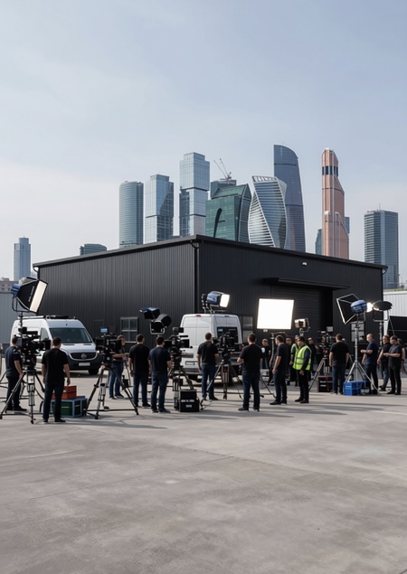 Дополнительное редактирование через встроенный ИИ: Make the pavilion larger and more prominent in the frame, add a film crew with cameras, lighting rigs, and tripods nearby, and show the Moscow cityscape in the background.