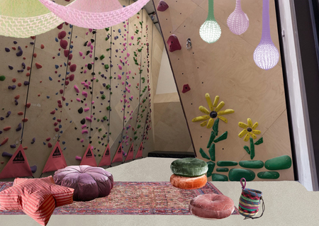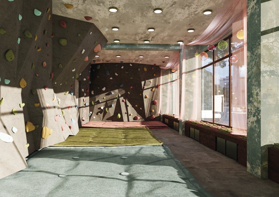 - для поддержания этой идеи был выбран яркий, местами детский, стиль в интерьере, большая площадь для зон отдыха и общения, создание кофе-поинта и коворкинга для посетителей, а также ключевая зона скалодрома и один общий зал для групповых тренировок.
